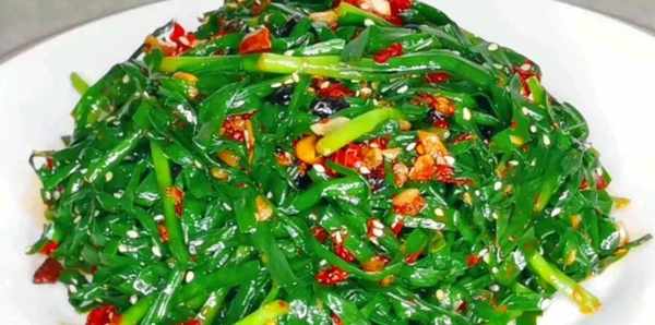 2、鍋中加水,水開後把韭菜頭加進來焯水20秒,再把韭菜葉加進來焯水20秒撈出過涼水,控幹水分,倒入盆中,碗中澆上熱油激發香味,加適量鹽、生抽、老抽、雞粉、白糖,加一大勺老幹媽攪拌均勻,將調好的配料倒入盆中。用筷子翻拌均勻,再來點芝麻香油,加點白芝麻拌勻裝盤,涼拌韭菜就做好瞭。