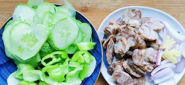 準備一根自傢灌的臘腸,切成薄片,一個青椒切成小塊狀,生薑改刀切成長條,洋蔥也切成長條,所有食材裝盤備用!鍋內放少許的花生油,油熱倒入洋蔥、薑條炒出香味,再倒入臘腸,多炒一會,炒出豬油,來少許的味極鮮,繼續翻炒均勻,最後放入黃瓜和青椒,炒到黃瓜和青椒發軟就可以,出鍋前放入1小勺雞精提味。