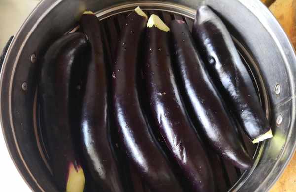 2. 茄子清洗幹凈,去掉底部,涼水上鍋蒸,開鍋計時8分鐘左右,再燜3--5分鐘,