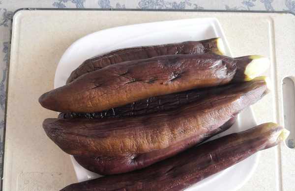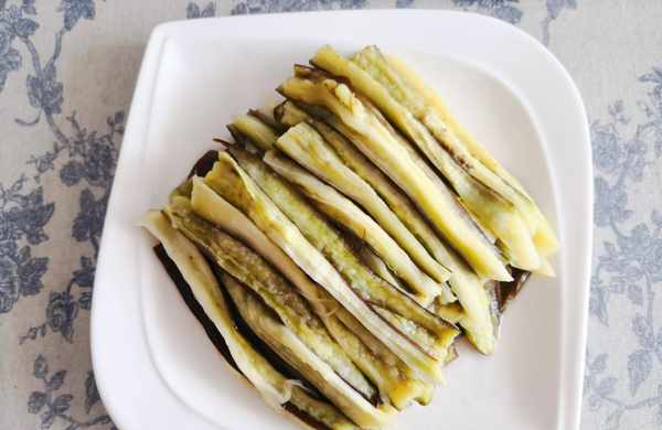 4. 茄子放涼後先用手攥一下茄子的水分,再撕成條擺盤,