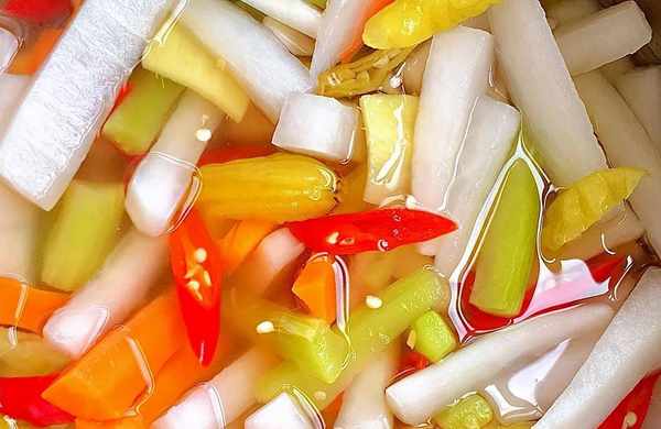 【食材】白蘿ト,萵筍,胡蘿ト,小米辣泡椒,薑,白糖,白醋,鹽
