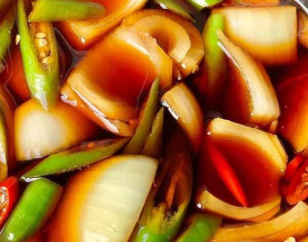1、洋蔥切小塊,小米辣、線椒切小段放入碗中。