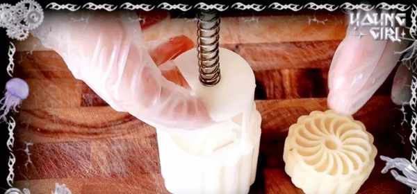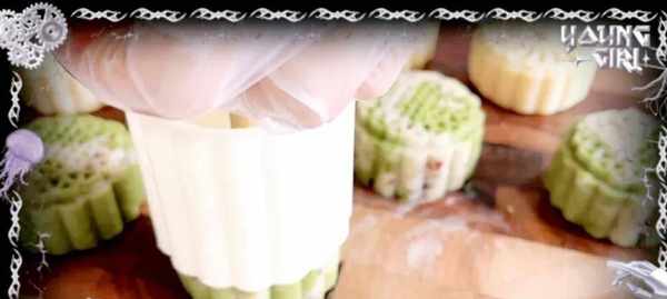 裝入模具以後再印出一個紋路,這個綠豆泥炒的一個軟硬度合適,模具不需要抹油呢,也不會粘模具的,而且它的紋路也會很清晰很立體。