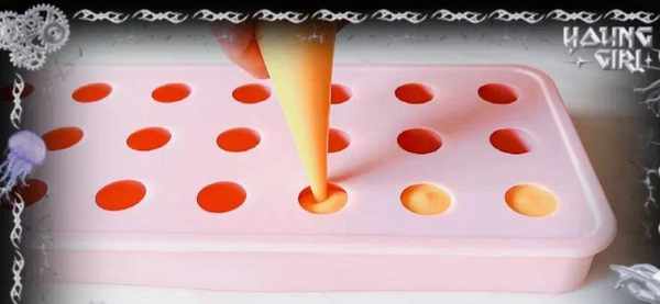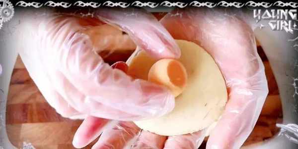 冷凍好的流心餡脫模,以後先放在冰箱裡面冷凍,要包的時候呢,再一個一個地取出來,我用到的是50克的一個月餅模具,取一個40克的桂花綠豆餡,包入一個流心餡,