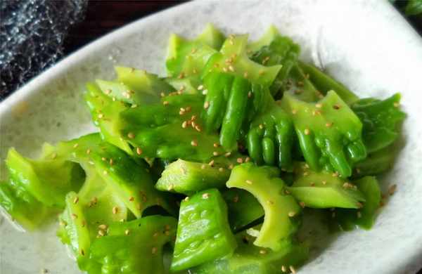 【糖醋苦瓜】所需材料:苦瓜1根、熟芝麻少許、鹽適量、白糖1湯匙、米醋2湯匙、