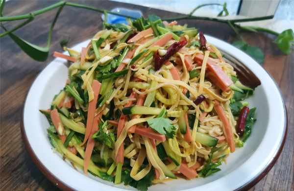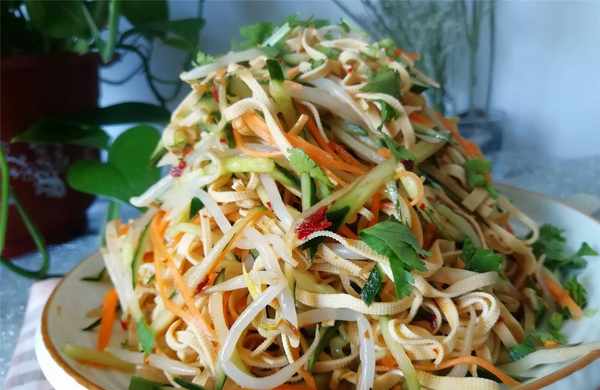 【傢常涼菜】所需材料:黃瓜2根、綠豆芽250克、胡蘿卜1根、幹豆腐3張、香菜1棵、辣椒油1湯匙、香油1湯匙、鹽適量、大蒜3瓣、白糖1湯匙、米醋2湯匙、生抽1湯匙、