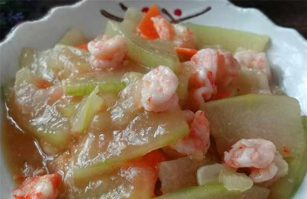 【蝦仁燒冬瓜】所需材料:冬瓜1斤、大蝦半斤、胡蘿卜1段、油鹽適量、蔥1段、薑2片、大蒜2瓣、料酒半湯匙、白胡椒粉1茶匙、蠔油、水淀粉適量、