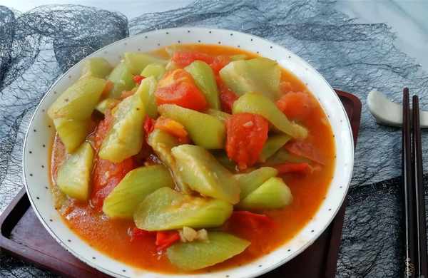 【西紅柿炒絲瓜】所需材料:絲瓜2根、西紅柿2個、油鹽適量、大蒜2瓣、