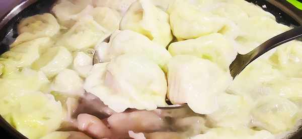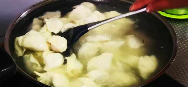 8、鍋中加入適量的水,大火燒開後,下餃子,把餃子用鏟子給它推動一下,防止餃子粘鍋,看著餃子再次浮上來瞭,胖胖的就熟瞭,盛出來。一道鮮美營養,好吃不油膩的西葫蘆素餡餃子就做好啦!