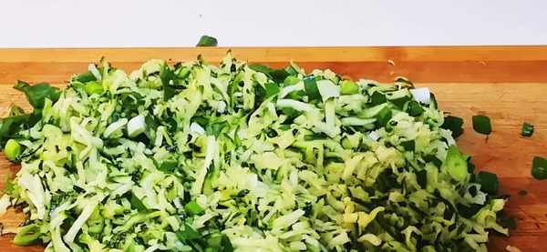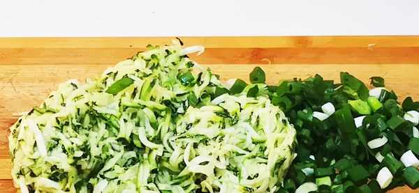 3、將醃制好的西葫蘆絲裡的水分劑幹,放入菜板上,和提前準備好的蔥花一起剁碎,放入盆中備著。