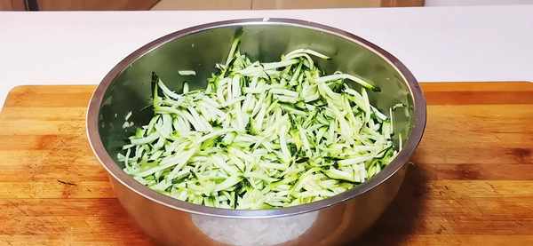 2、將清洗幹凈的西葫蘆,對半切開,把西葫蘆裡面的瓤和種子清理幹凈,再把去瓤和去種子的西葫蘆插成細絲,放入盆子中,再放入一點食用鹽,拌勻後,醃制10分鐘,這一步是把西葫蘆裡面的水分去一下,這樣包餃子的時候就不下水瞭。