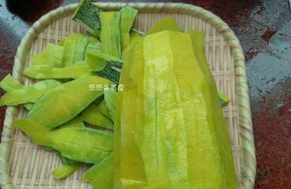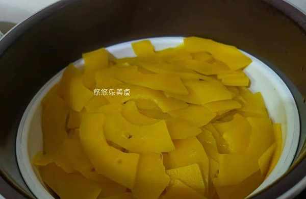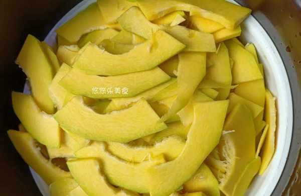 1.準備好的南瓜要將其表皮去掉,南瓜去皮後切成細片,然後放入鍋中蒸煮。切片要盡可能地切薄片,蒸煮的時候容易熟;