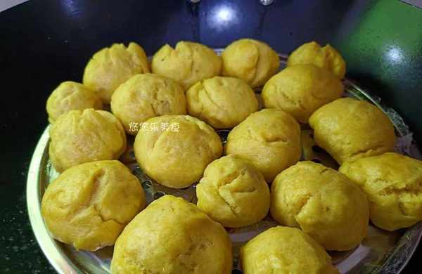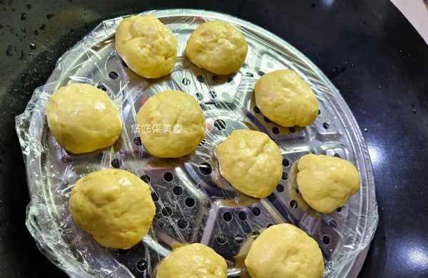 5.用手將準備好的南瓜團子放在蒸籠上。鍋中加入適量的水,鍋中的水分開後,將準備好的面團放在上面,然後上鍋蒸15分鐘左右;