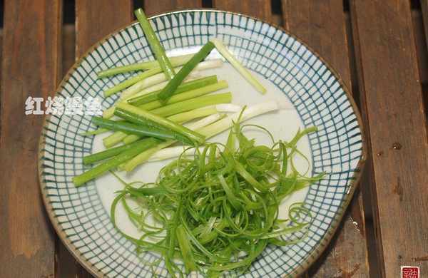 2. 小蔥處理幹凈後,蔥白與蔥綠的上半部分切成蔥段,剩下的蔥綠處理成蔥絲。