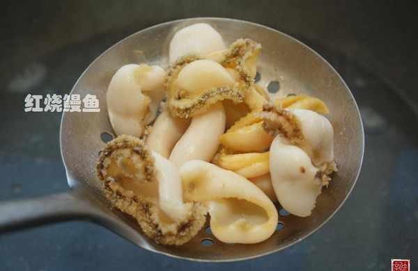3. 煮開水,下鮑魚,數10秒,立即將鮑魚撈起,盡量讓鮑魚片攤開,讓其自然涼卻。