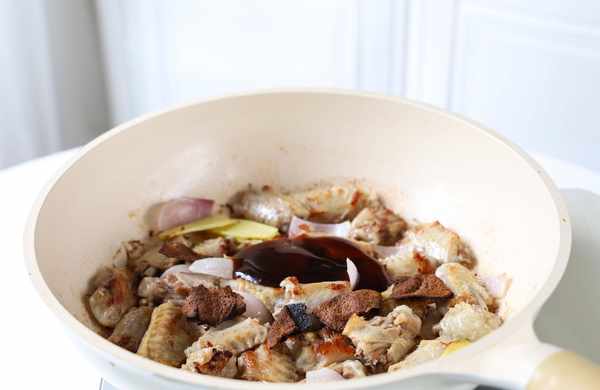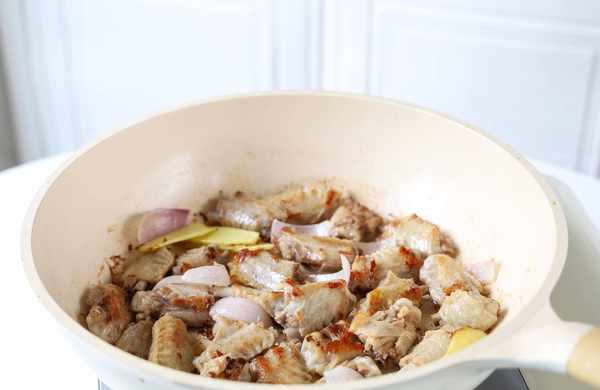 3.鍋中放入鴨翅、薑片、蔥頭,翻炒至鴨翅表皮焦黃