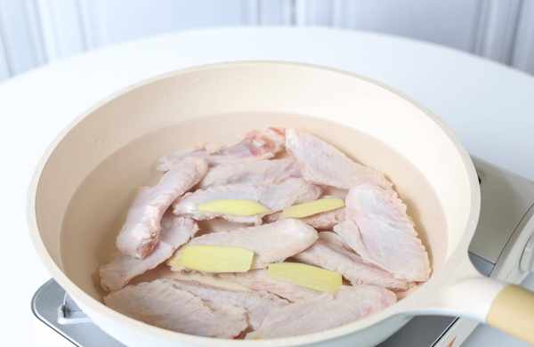 1.鍋中倒水,放入鴨翅、薑片以及少許料酒,開大火煮沸