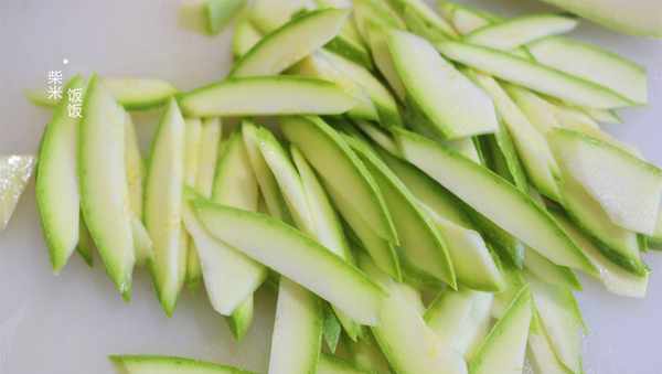1,西葫蘆洗凈,對半切開,去掉比較老的瓜瓤,然後切成片。