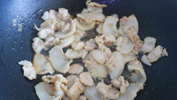 3,熱鍋倒入少許油,再倒入切好的五花肉片,大火炒幹水分,再轉小火煸炒出一部分的油脂。