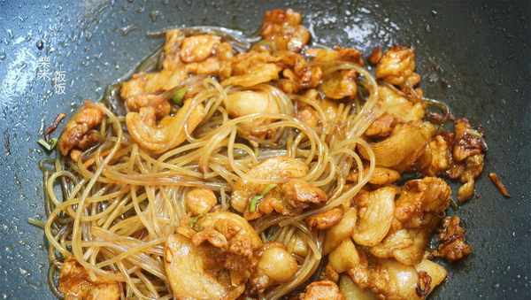 5,把泡軟的粉條倒進來,再加小半勺老抽上色,大火翻炒均勻。