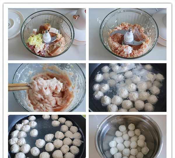 順便分享一下肉丸子的做法。①500克豬肉切成小塊放入料理機中,加蔥、薑、鹽、胡椒粉、100克冰水,絞打成肉糜。②接著再加入100克冰水,絞打至肉餡黏稠且有彈性的狀態。