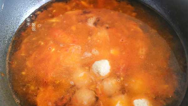 1,西紅柿去皮洗凈,切成小塊。炒鍋中加少許油燒熱,倒入西紅柿,大火炒出湯汁。然後加入適量的清水,再加入肉丸,大火煮開後轉中小火煮2分鐘。