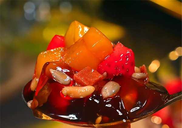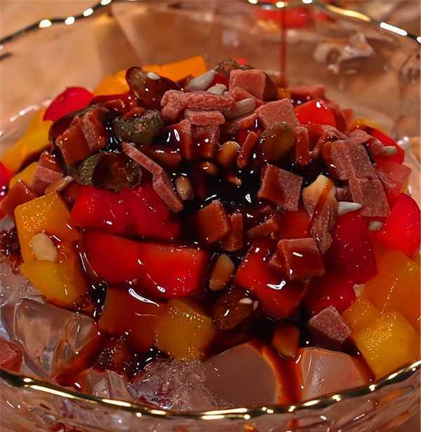 將冰粉放入碗中,加一些冰碎,各種配料,最後澆入紅糖汁。