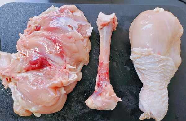 第1步,我們在做飯之前先蒸上米飯。把買來的雞腿清洗幹凈,放進清水中浸泡一會兒,浸泡危險水,控幹水分之後,放在案板上,用剪刀從雞腿的一側剪開,把雞腿去骨。