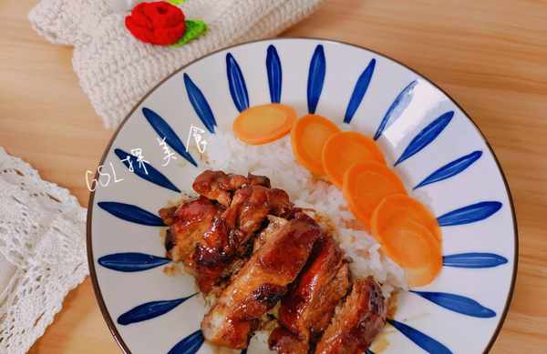 第6步,把制作好的雞腿放進案板上,切成小塊狀,再放在米飯上,放上焯過水的胡蘿卜,把剩餘的料汁澆在上面,這道照燒雞腿飯就做好瞭。