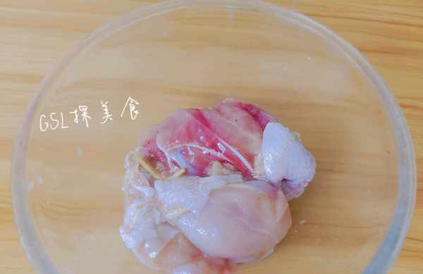 第2步,把整理好的雞腿放進大碗中,裡面加入薑絲,料酒,食鹽,胡椒粉,充分地抓拌均勻,蓋上保鮮膜醃制30分鐘以上。