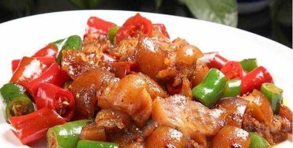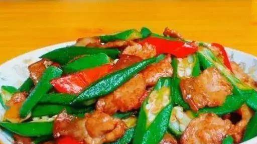 4、油在大的紅辣椒和秋葵,翻炒一會兒,加醬油,糖,翻炒。在平底鍋裡倒入豬肉,然後攪拌出鍋。
