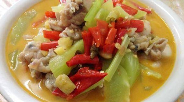 材料:牛蛙兩隻,萵筍一根,芹菜兩根,長泡椒,小米椒,生薑,胡椒粉,淀粉,高湯精,鹽,食用油,料酒,白糖