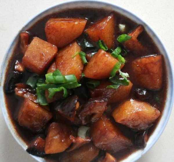 2、 熱鍋後倒入適量油等油熱後調成中火再倒入香菇炒出香味,再把土豆倒入鍋中翻炒,這時加一小勺海鮮醬和適量老抽,同時加水,水位沒過香菇土豆,再加冰糖、鹽少許,水煮開後用小火慢燉至收汁,盛盤後撒蔥末少許既可。
