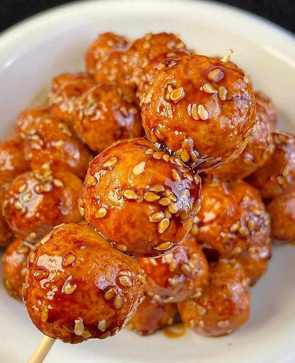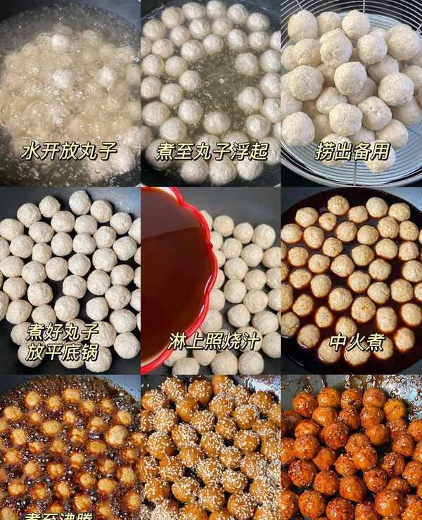 3、煮好的丸子放平底鍋裡面,淋上我們調好的照燒汁。中火煮沸騰,大火收汁,撒上芝麻翻拌均勻即可。
