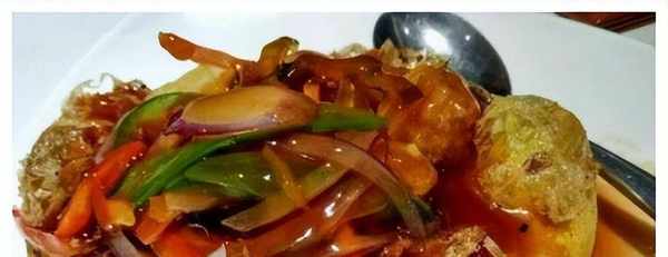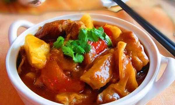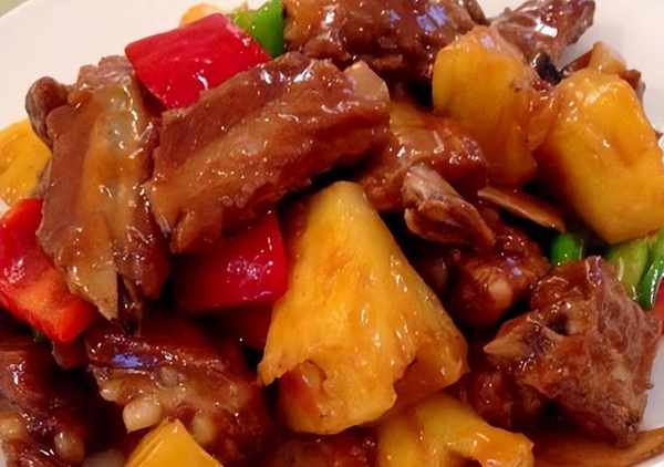 4.倒入之前調好的番茄醬汁;再次湯汁收濃;倒入菠蘿、青紅椒;翻勻,即可出鍋;小貼士:因為在燒排骨時放瞭冰糖,所以番茄醬汁中沒有再放糖,如果之前沒放冰糖,番茄醬汁需要放一到兩匙糖來調整酸甜度。