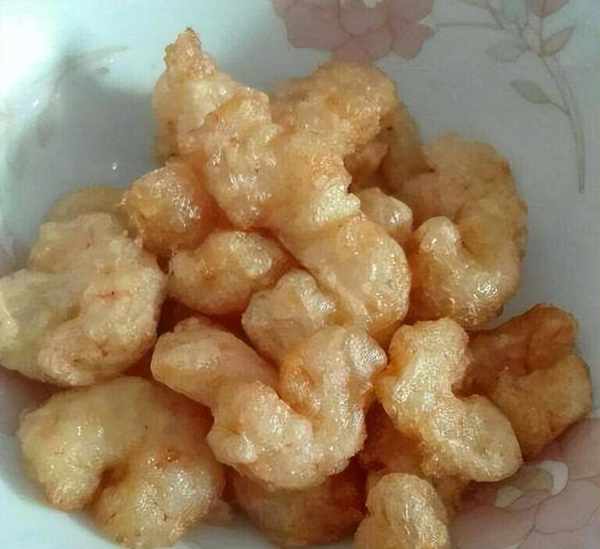 2、鍋放油,小火燒開,蝦沾滿幹淀粉後放入鍋中,炸熟炸酥,撈出瀝油。