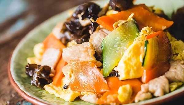 用料豬瘦肉140g;黃瓜半根;胡蘿卜半根;雞蛋2個;木耳適量;料酒;淀粉;鹽;糖