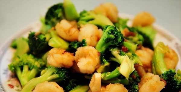 3、鍋中倒入少許油,下蒜末和蝦仁翻炒變色後,放入西蘭花翻炒均勻即可出鍋