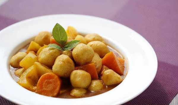 材料:魚丸150克 土豆2個紅蘿卜1根 洋蔥1個黃彩椒1個咖喱適量 油鹽適量