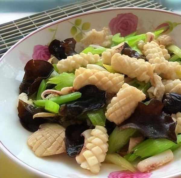 木耳提前泡發,撕小朵。西芹斜切薄片。燒一鍋開水,水開後下魷魚,燙一下立刻撈出,過涼水,備用。(魷魚一入開水立刻就打卷瞭,立刻撈出。)蒜切末,薑切絲。料酒、生抽、蠔油、鹽、胡椒粉、雞精加生粉和清水調成料汁。