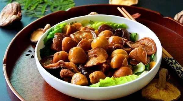 2、鍋燒熱下油,下薑片爆香,再下香菇炒出香味,隨後下蒸好的栗子炒勻,加快要沒過菜的水;