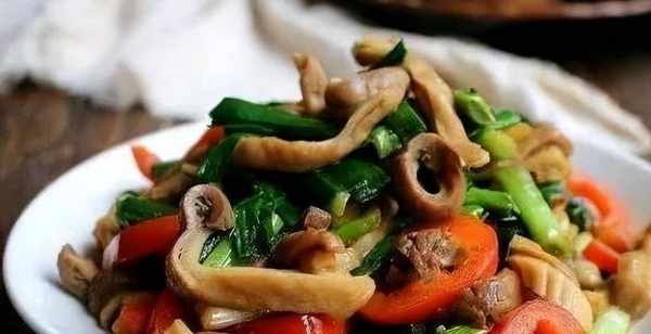 4、再加入豬肚條翻炒入味,加入蒜白段,快速爆炒至蒜白斷生
