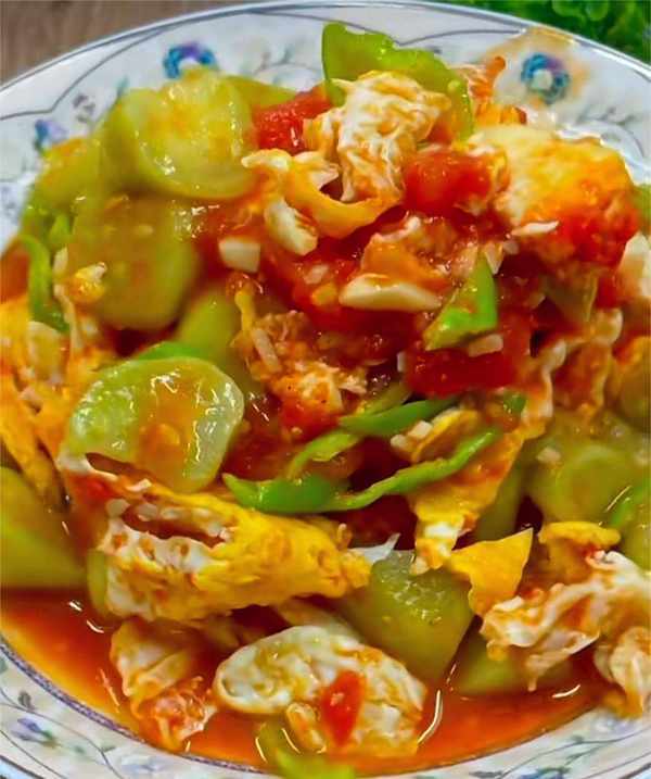 步驟三:鍋中燒油,下入蒜末炒香,把番茄下鍋炒出沙,再把絲瓜塊下鍋翻炒均勻,雞蛋塊也下鍋,加入鹽、生抽、陳醋,青椒絲也下鍋,咕嘟入味即可。拌米飯超級下飯,雞蛋也吸滿瞭番茄的湯汁,軟軟滑滑的絲瓜,口感超棒。