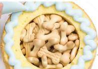 在取出的蛋糕,中間挖洞,註意不要破損,中間掏空,放入狗骨頭餅幹,再把剛才挖洞的頂蓋上,這樣蛋糕裡面就有骨頭瞭。