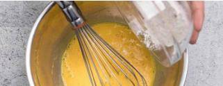 打發蛋白,砂糖分三次加入,加第三次糖的時候加入玉米淀粉;