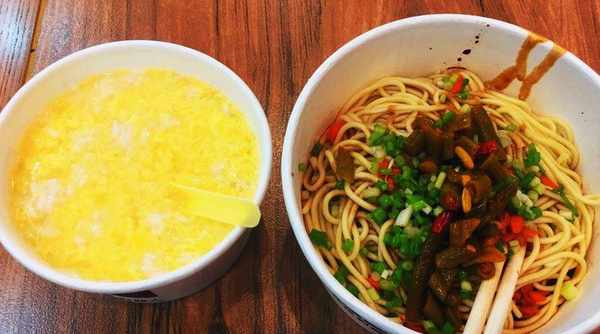 但很多外地人吃過以後,都表示太噎人瞭。一大坨面條混在一起,攪也攪不開,吃進嘴裡特別幹澀。其實,吃熱幹面也是有技巧的,面一拿到手裡就要趁熱幹凈攪拌,這樣才能把芝麻醬攪勻。吃熱幹面的速度也要快,這樣才能在它起坨之前就吃掉,這也是為什麼武漢人打包熱幹面後,會一邊走路一邊吃面瞭。如果你吃得比較慢的話,可以配上一碗蛋酒,吃一口熱幹面喝一口,既不會覺得幹澀,芝麻香配上蛋酒香,美味!