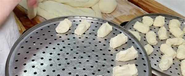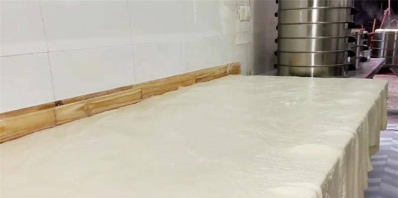 店裡早上4點多就要開始幹活,和面、制作當天要用到的各種餡料,一直要忙到早上7點左右,第一鍋蒸好的包子才能出爐,所以每天7點左右才開門營業。店裡包包子的面皮跟其他包子店的面皮不一樣,和好的面皮平整的鋪在面板上,然後把凝固的豬肉均勻的塗抹在面皮上,然後把面皮對折用搟面杖再搟平,然後再塗抹上豬油,這樣操作來回2-3次,塗抹過豬油面皮包出來的包子皮是分層酥口的。