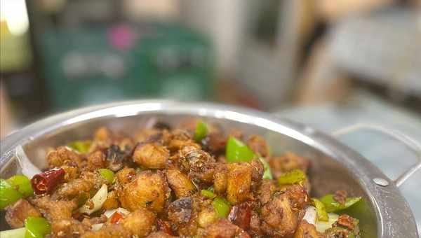 辣子雞是店裡最受好評的一道菜品。老板將新鮮的雞,切成小塊,加鹽、料酒碼味後,放入熱油中,炸至金黃撈出,鍋中留少許油,下幹辣椒、花椒炒香,再將炸好的雞塊倒入其中翻炒,並撒入適量鹽、味精、胡椒、白糖等調料調味即可,炒好的辣子雞,酥香麻辣,咸鮮醇厚,回口略帶微甜,十分美味。