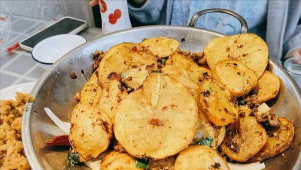 幹鍋土豆是店裡的特色菜品之一,這道菜屬於傢常菜,老板制作這道菜品時,會先將土豆切片,放入熱油中炸酥撈出,然後下入幹辣椒、豆瓣醬、花椒、肉沫爆炒,肉沫炒至變色後,再將土豆片倒入鍋中,翻炒均勻,最後盛裝在特質的小鍋裡,邊煮邊吃,這樣炒出來的土豆,外酥裡美,咸辣味足,焦香可口,超級下飯。