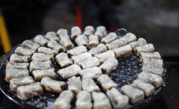 東山縣的金錢肉顧名思義其形如古代銅錢故而得名。金錢肉鮮亮的色澤光是看起來就讓人垂涎欲滴,瘦肉肥肉相間的金錢肉,像一根巨大的烤串吃的時候把肉剔下來,加上蘿卜絲一起吃,解膩開胃,肥肉不油,瘦肉不柴。